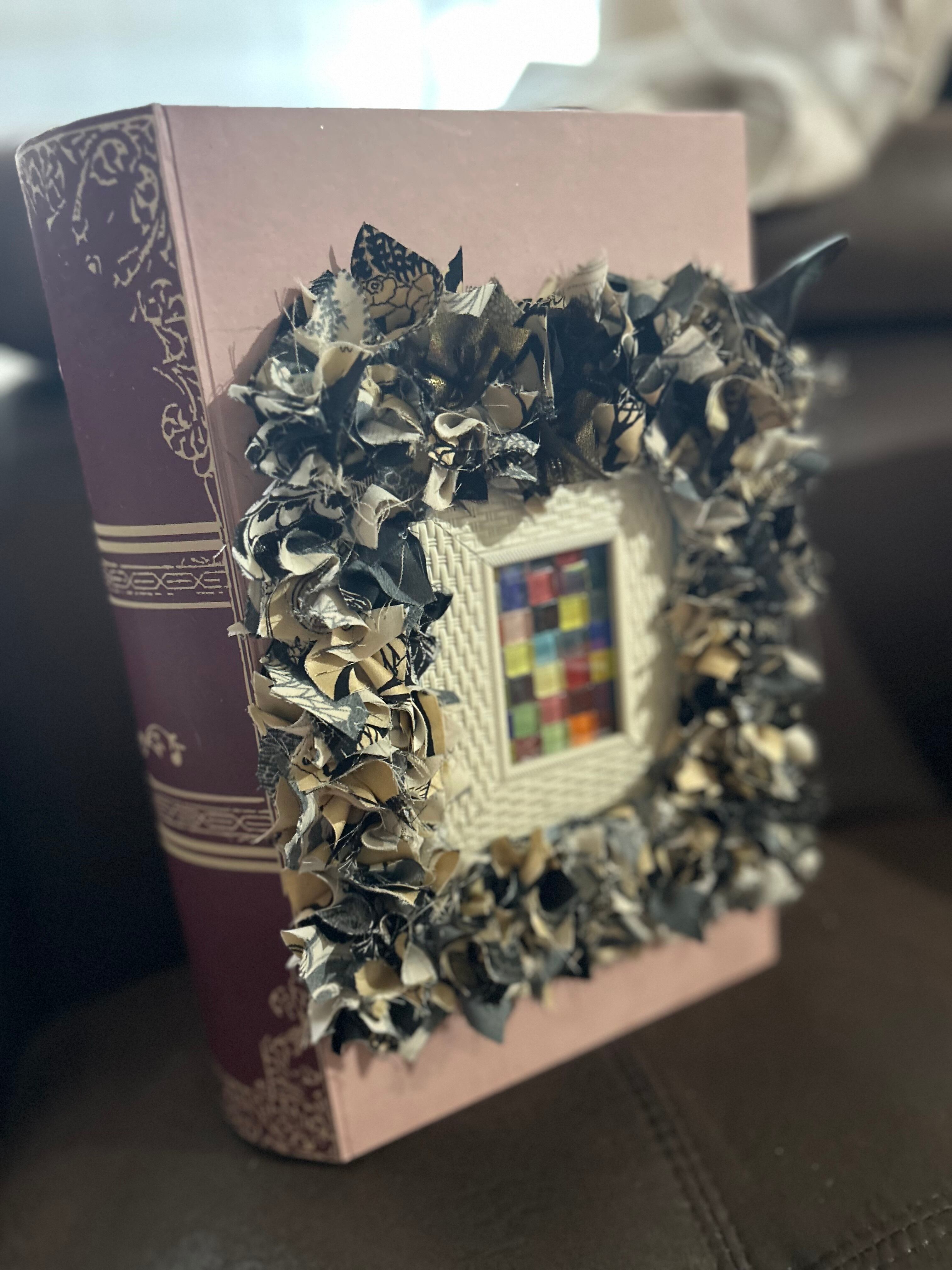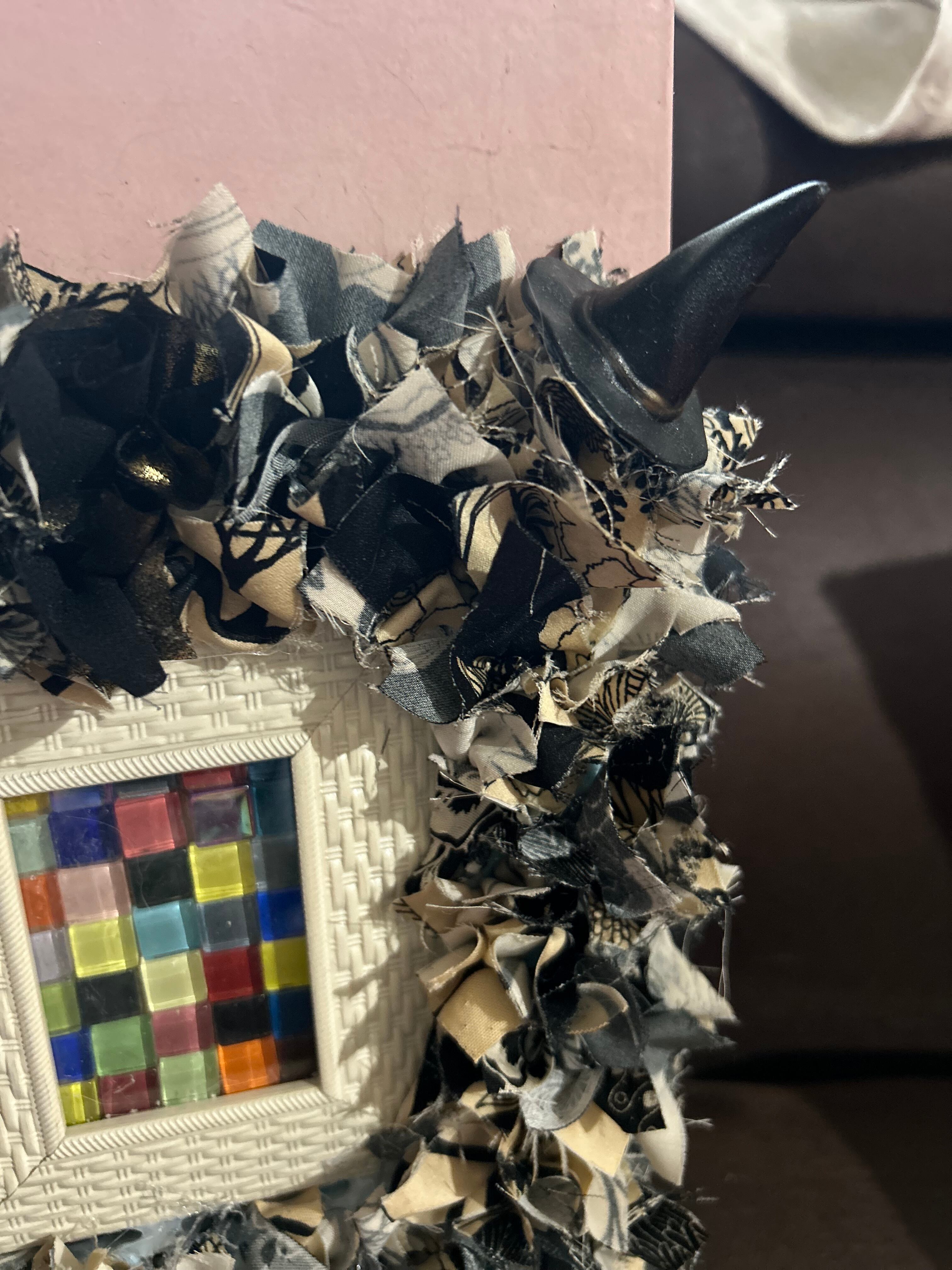 ドレスに使用した生地をリースを制作するように額のようにつけています。中心にはガラスモザイクを細工しました。小さな黒いとんがり帽子もついています。ドレス生地で仕立てた箱は、彼女の楽屋。