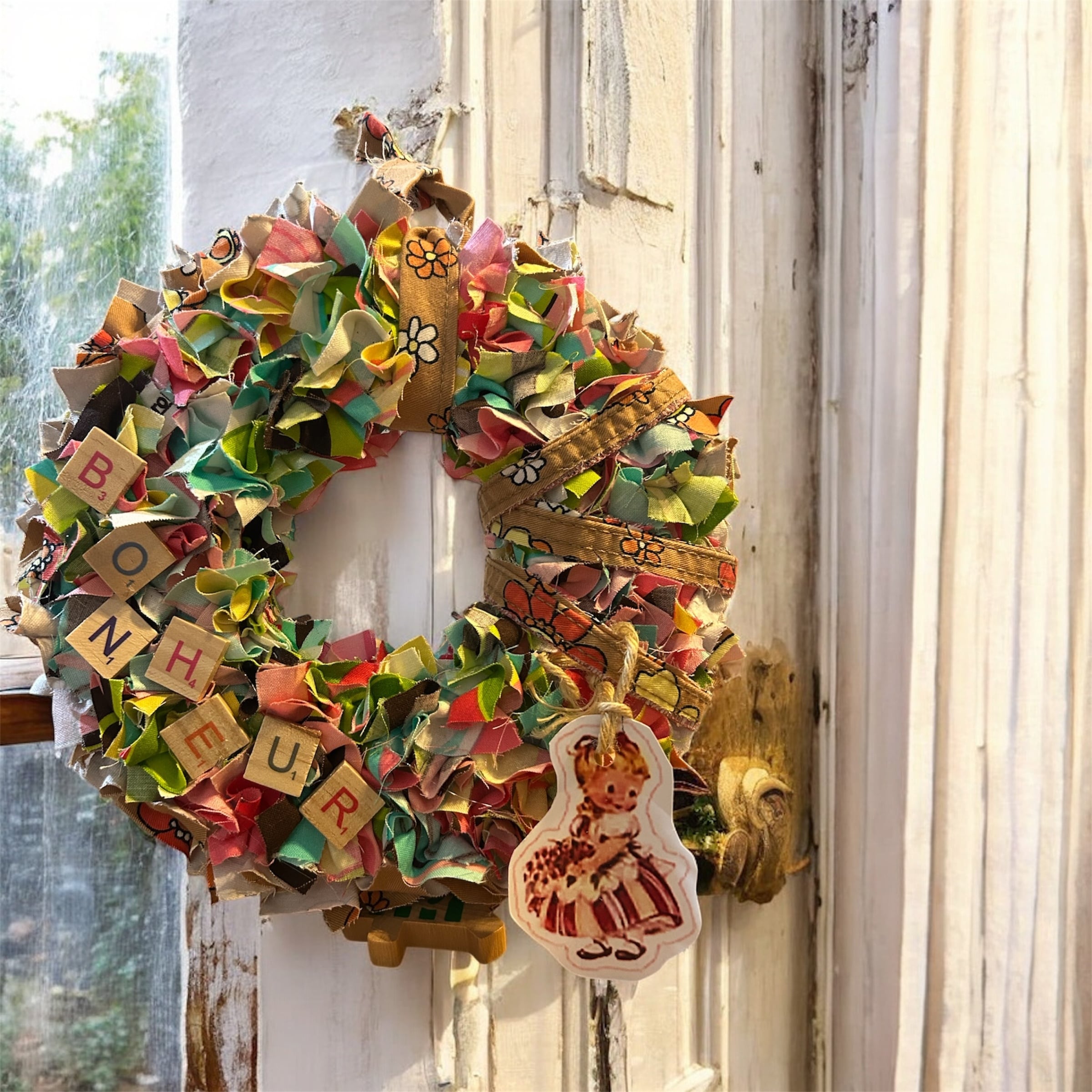 サイケな綿生地を使用し、丁寧な手仕事で仕上げています。その独特のデザインと質感が、あなたの個性を引き立ててくれるでしょう。飾りの女の子は取り外しできます。お家にあるオーナメントを飾られても素敵だと思います。